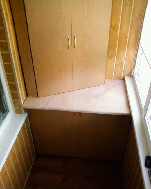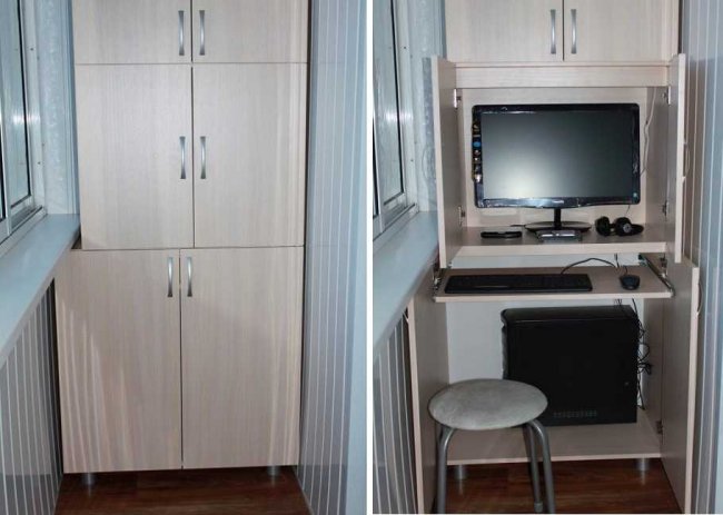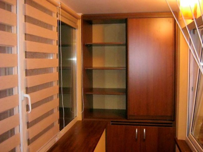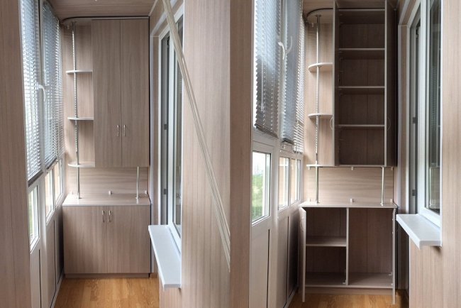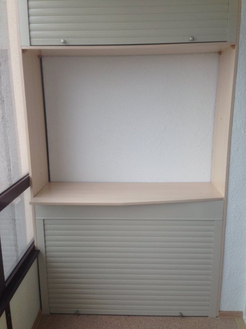 При желании можно оборудовать на балконе рабочее место, используя одну из полок шкафа как стол. Это отличный выход из положения в условиях дефицита свободного пространства в квартире. На верхних полках удобно разместятся книги и папки с документами. Нижние подойдут для размещения оргтехники.