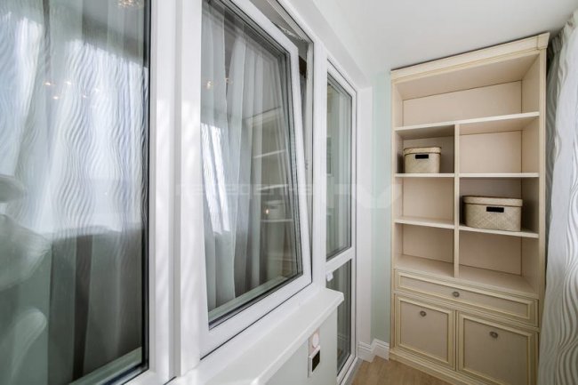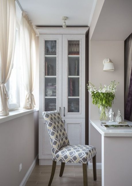 В пространство балкона отлично впишется угловая система хранения. Она позволит задействовать дополнительные, порой столь необходимые сантиметры и при этом не будет выглядеть громоздко. Угловой шкаф «до потолка» поможет рационально использовать пространство и вместит множество вещей.