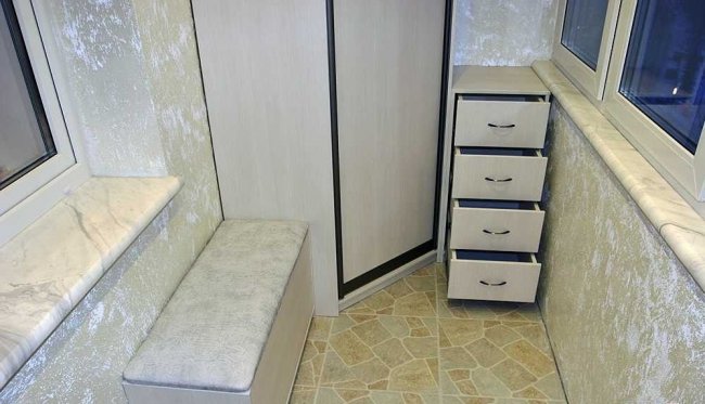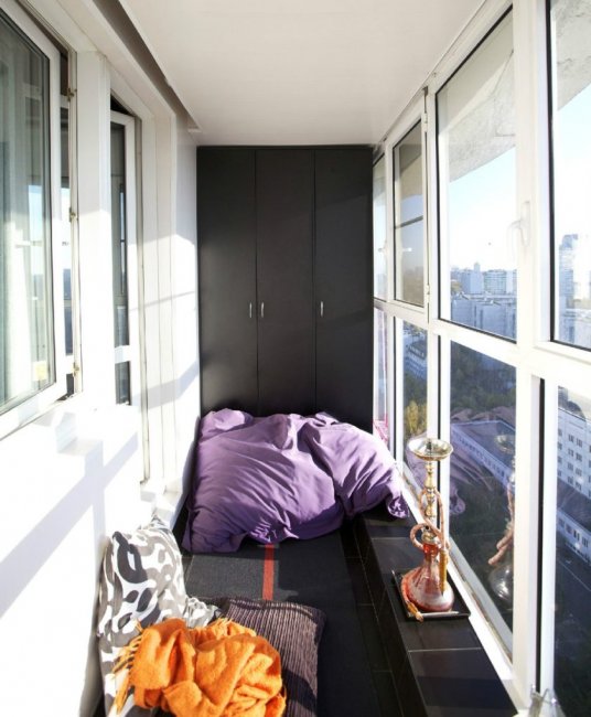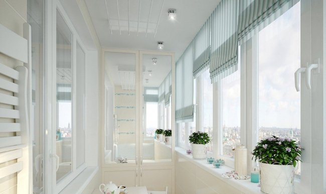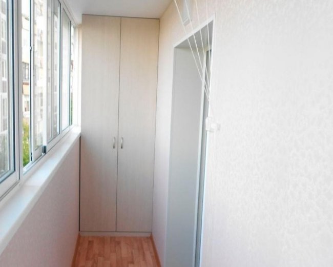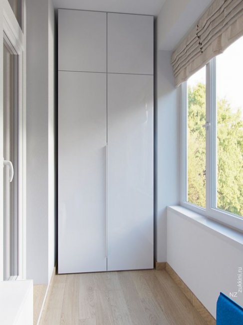 Если габариты лоджии позволяют, шкаф можно расположить и вдоль длинной стены. Главное, чтобы он не мешал передвижению и легко открывался. Идеально подойдет система с раздвижными дверями.