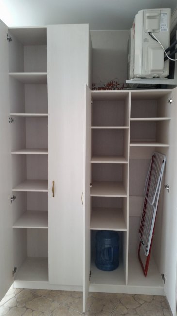 Если вы планируете хранить в шкафу сушилку для белья, пылесос, швабры, удочки, лыжи, вам лучше отказаться от наполнения и, хотя бы одну часть шкафа сделать без полок.