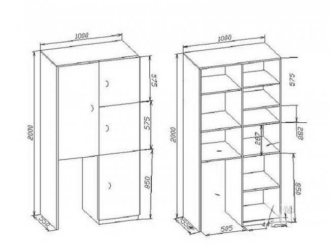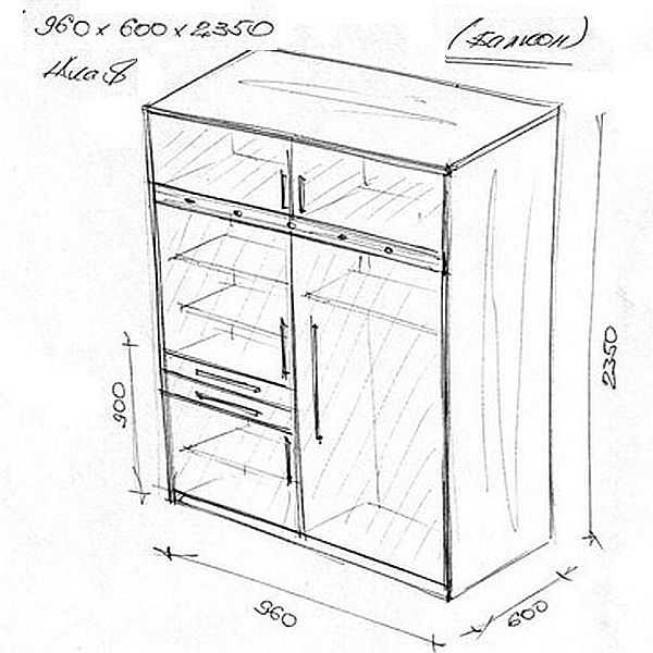 Составляем чертеж желаемого шкафа. На схеме учитываем все элементы и наполнение.
