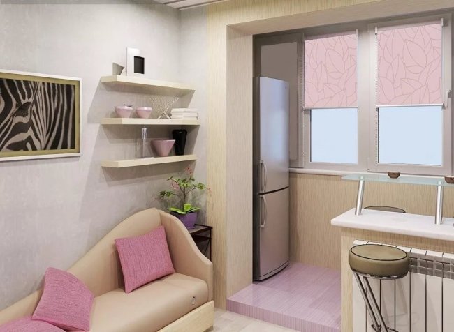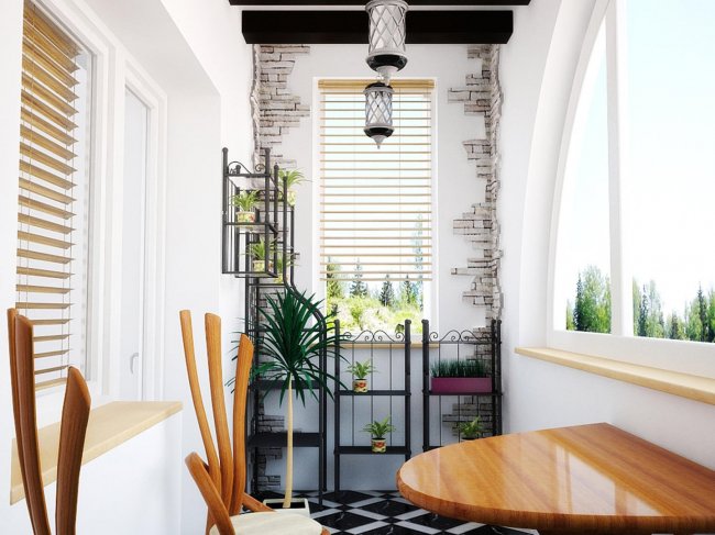 Без длительного и затратного процесса можно убрать оконный блок и дверь, сохранить надоконную перемычку, стену под окном, порог. Выход на лоджию оформляют в форме асимметричной арки. Оригинальный вид криволинейному покрытию придают искусственным камнем, панелями под кирпич, декоративными вставками. Из подоконного блока получается столешница, барная стойка, подставка для цветов, сувениров, аквариума. Оригинально выглядят полки, установленные по всей высоте бывшего оконного проема.