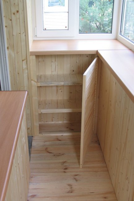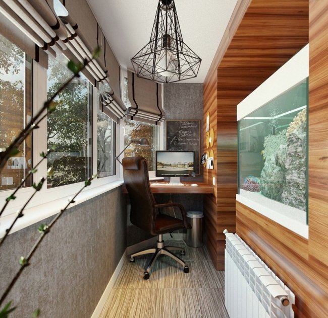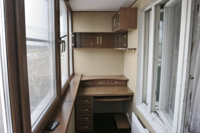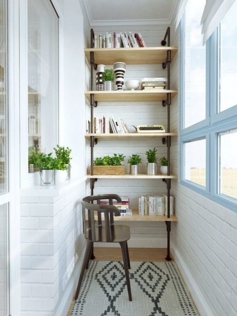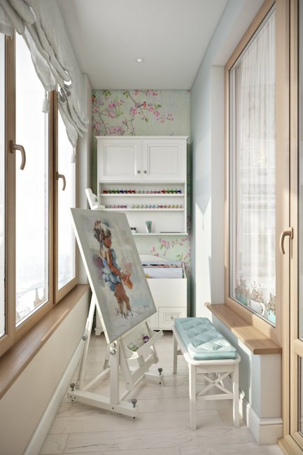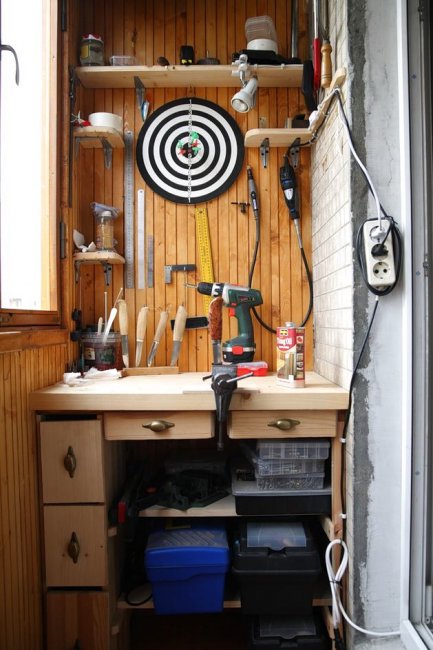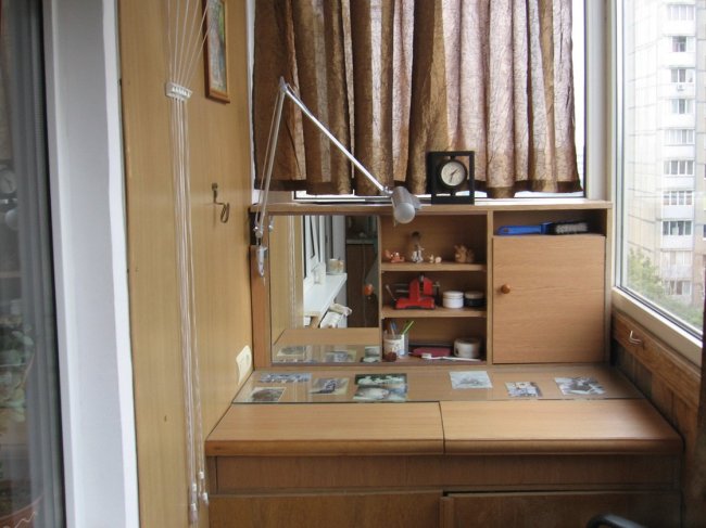 Для оборудования понадобится удобный стул и функциональный стол, полки. Ящики, стеллажи для инструментов легко соорудить из подручных материалов самостоятельно. В торце поместится швейная машинка, верстак, мольберт. Для экономного использования пространства стол можно заменить длинной столешницей по всей длине лоджии.