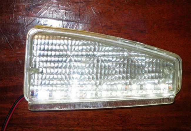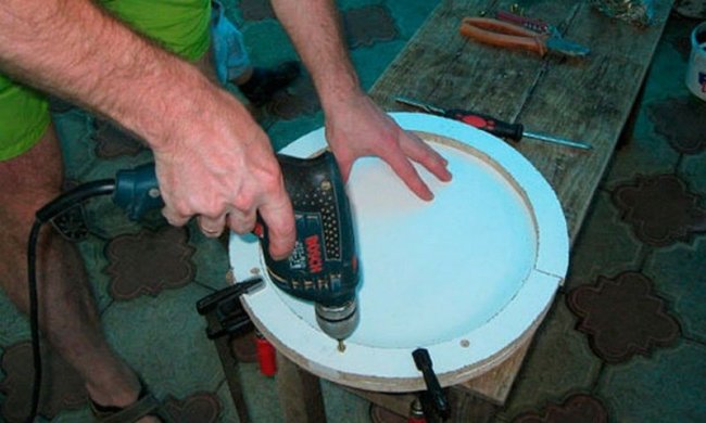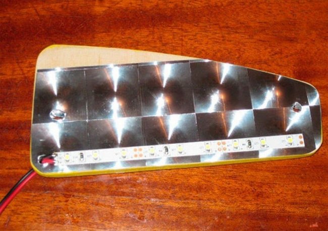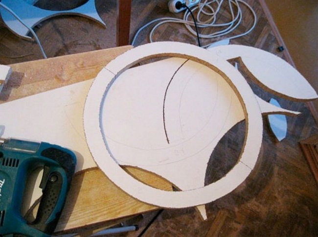 На одной из торцевых частей с помощью электролобзика аккуратно вырезаются отверстия под фары и радиатор.