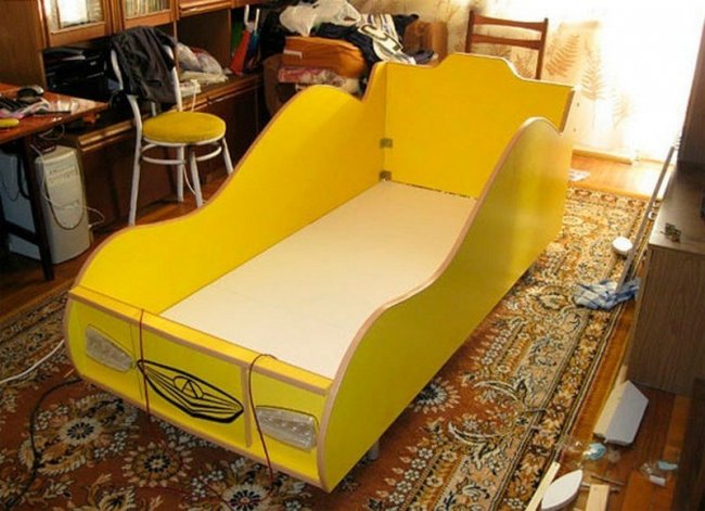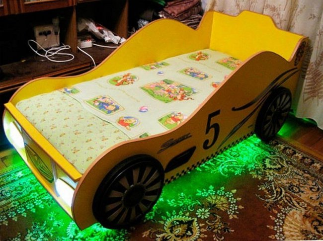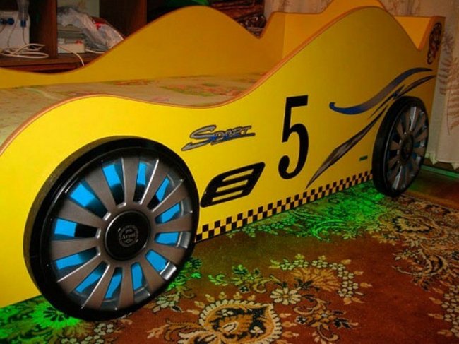 Необычно выглядит мебель, выполненная в форме машинки. Это вариант для более взрослых детей, не достигших подросткового возраста. Нестандартное оформление позволит сделать незаметные шкафчики внутри, скрытые под капотом или за дверцей. Со многими элементами придется повозиться, что потребует определенных столярных навыков.