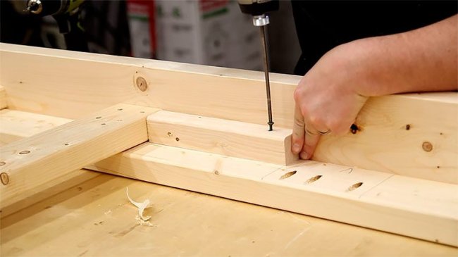 Подготавливают основание для матраса. Для этого к деревянным боковинам с помощью саморезов крепят металлические уголки. К ним сверху фиксируются ламели, перпендикулярно боковым стенкам.