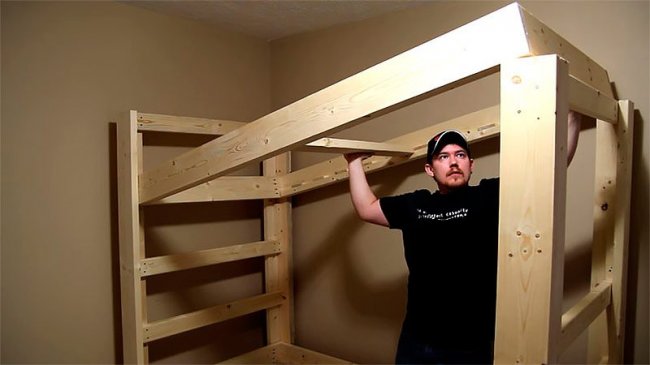 Это идеальный вариант для семьи с двумя детьми одного возраста, будь то мальчик и девочка или однополые малыши. Конструкция двухъярусной кроватки повторяет одноярусную. Небольшое отличие заключается лишь в наличии лесенки, высоте изделия, креплении двух лож на одних опорах. Для безопасности сверху предусматривают бортик, расположенный по всему периметру. Чтобы разобраться во всех тонкостях модели, рассмотрим мастер-класс по изготовлению такой кровати: