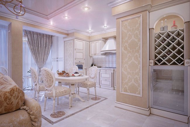 Часто в классических интерьерах присутствует симметрия. Квартира-студия может быть оформлена высокими колонами, креслами, декором, расположенным друг напротив друга. Парное обустройство создает ощущение порядка и стабильности. Мягкая мебель должна быть массивной и добротной. Деревянные участки перил, подлокотников, фасады шкафов могут быть украшены резьбой.