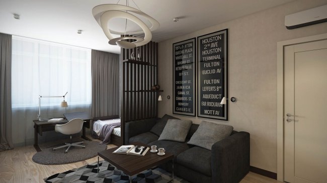 Разграничить пространство в просторном помещении можно за счет декора стен и правильной расстановки мебели. Зону приготовления пищи отделяют с помощью ширмы, барной стойки, небольшого подъема кухни. Скрыть спальное место в квартире студии можно занавесками на балдахине или передвижными перегородками.