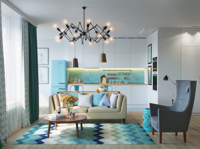 При разграничении пространства на несколько зон надо обязательно выделить каждый участок с помощью света. Тип осветительных приборов и способ их расположения зависит от предпочтений и потребностей домочадцев. Светильники могут быть выдержаны в одном стиле или быть абсолютно разного дизайна. Чтобы сделать перепланированную комнату максимально комфортной, надо учесть следующие моменты при расположении источников света: