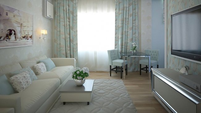 Гостиную стоит выделить на фоне остальных комнат. Оптимальным решением будет создание контрастной цветовой гаммы. Сочетаются холодные и теплые оттенки стен, мебели и ковров. Можно выделить обеденную зону в самой гостиной. Для ее оформления подойдет стол с прозрачной поверхностью и металлические стулья. Увеличить объем визуально помогут яркие обои. Хорошо смотрятся большие графические изображения. Для поклейки обоев желательно выбрать только одну из четырех вертикальных поверхностей. Освещенность ухудшится, если оклеить две стены. Для оформления окон подходят легкие тонкие занавески. Для хранения одежды можно использовать шкаф-купе с большими зеркалами на дверях. Выбирая светильник, стоит обращать внимание на его мощность. Компактная люстра уместна в минималистском интерьере, а в остальных случаях предпочтение следует отдавать большим осветительным устройствам.