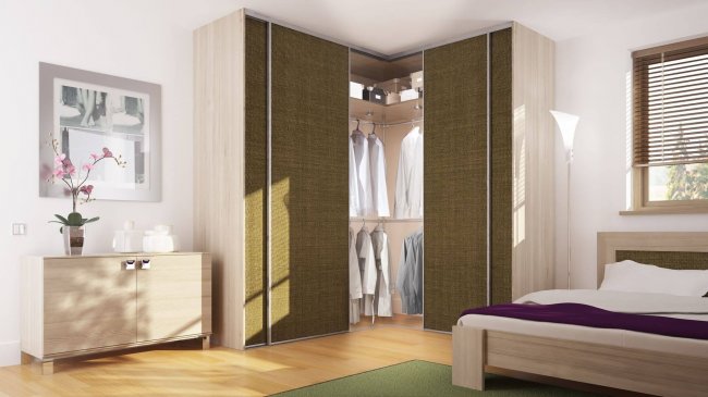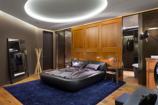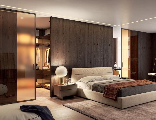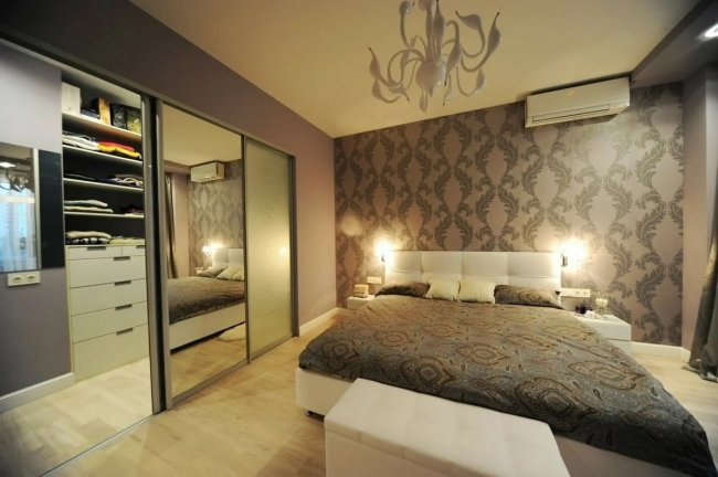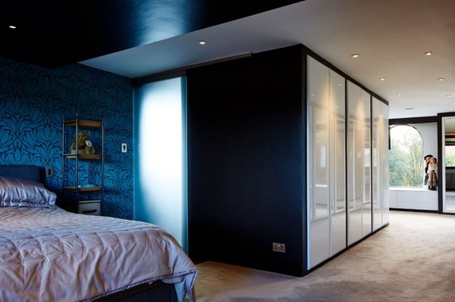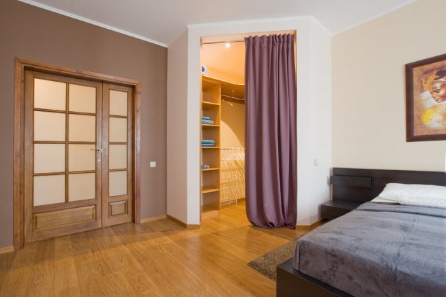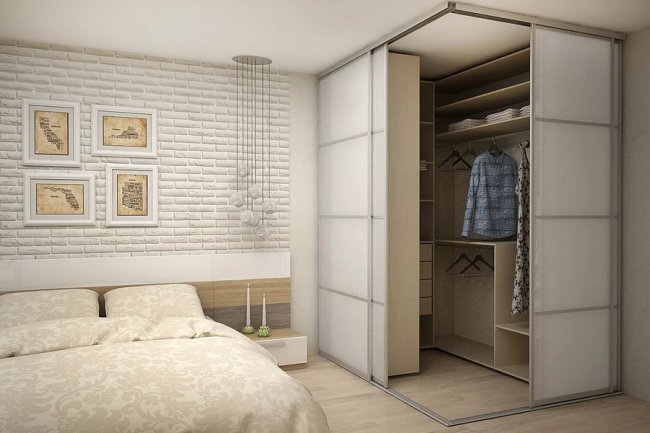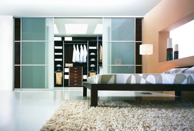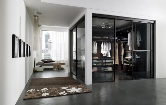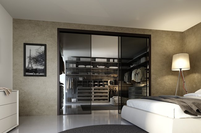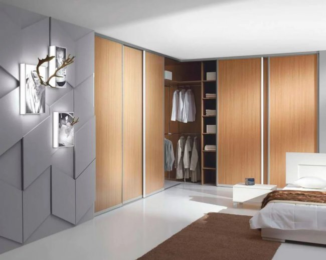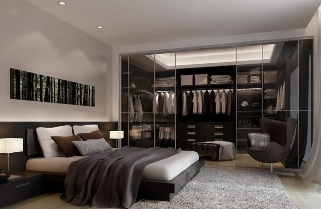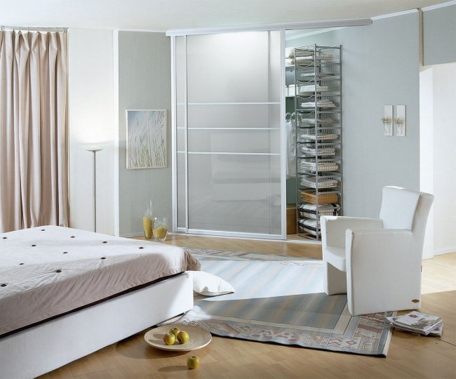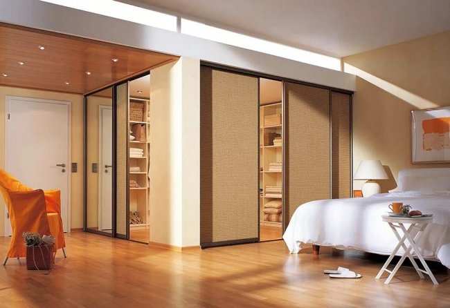Для отделки гардеробной в спальне чаще используют те же материалы, что для стен и пола. Выбор дизайна зависит от предпочтений владельцев. Если из спальни есть выход в ванную, гардеробную лучше отделять специальной водонепроницаемой ширмой.