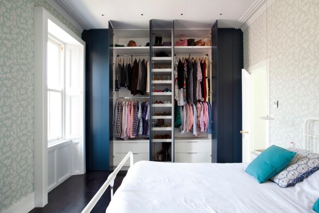 После того как место для гардеробной в спальне выбрано и установлена основная конструкция, следует заняться ее отделкой. Отсек для хранения одежды может быть выполнен в виде потайной комнаты, закрытого пространства за шторой или перегородкой, обычного встроенного шкафа. Если позволяет площадь и планировка квартиры или дома, гардеробную оформляют как отдельную комнату.