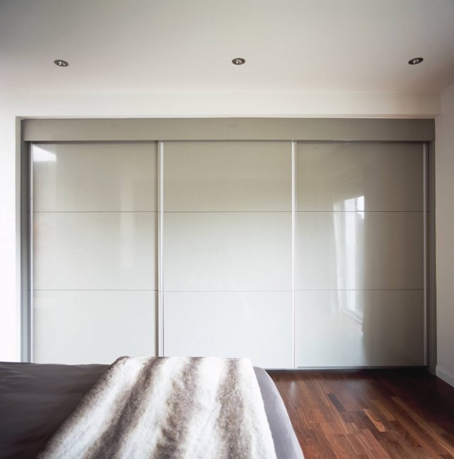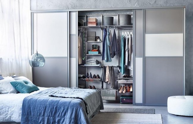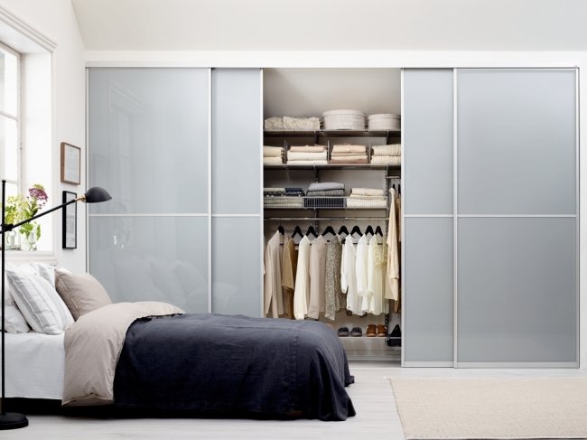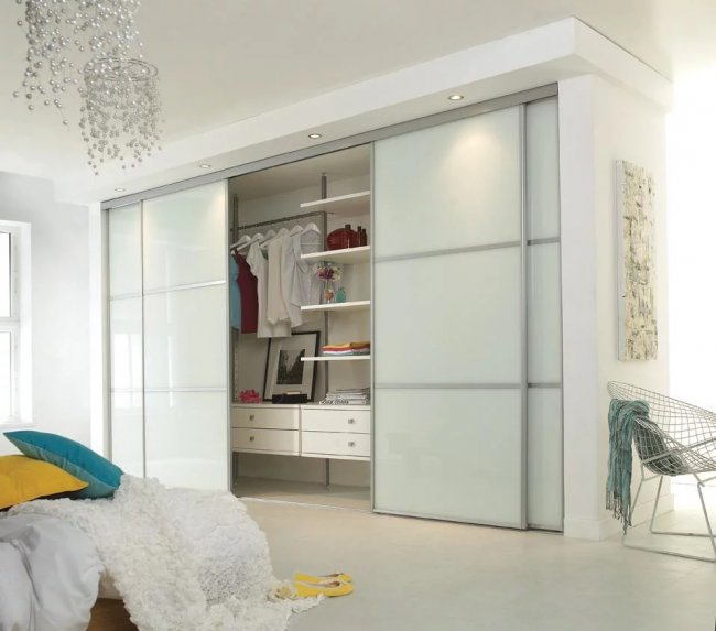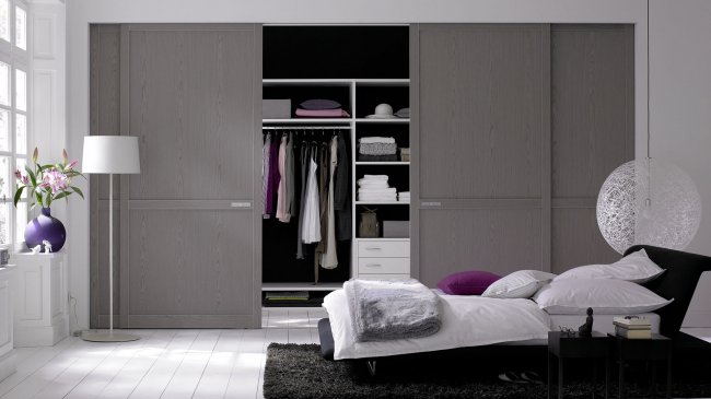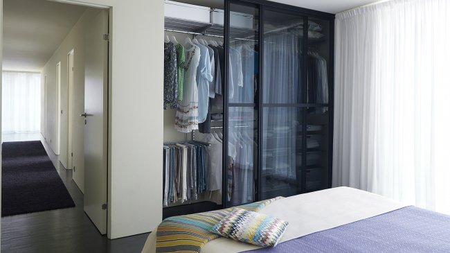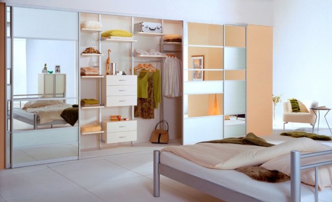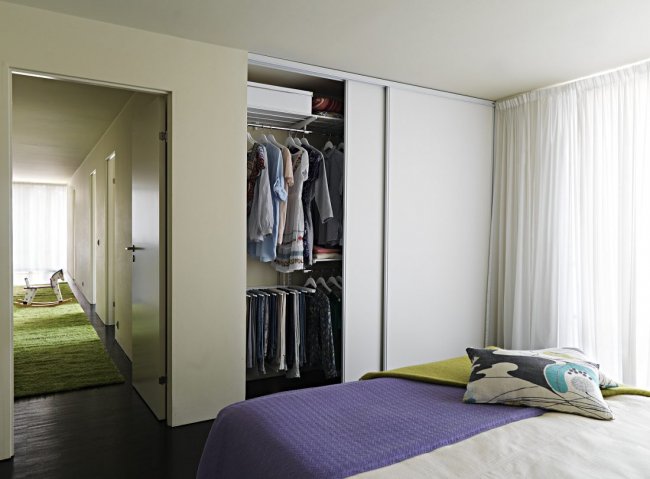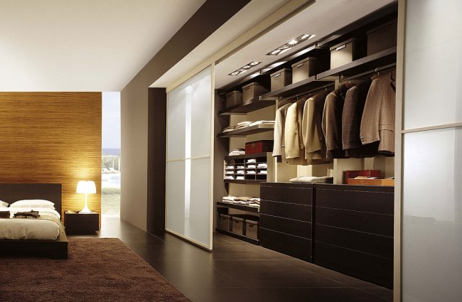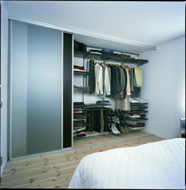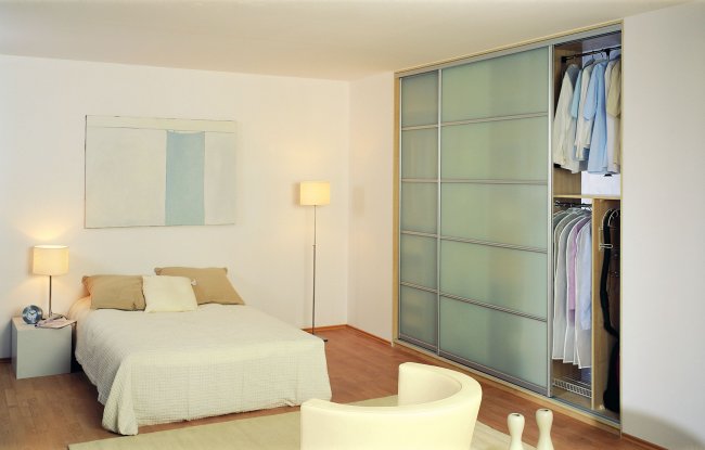 Встроенную гардеробную можно организовать в спальне, где имеется ниша, либо к ней прилегает чулан или кладовая. Если же таковые объекты отсутствуют, то для организации уборной можно выделить часть комнаты, отделив ее от оставшегося пространства перегородкой с раздвижными дверьми. При этом стоит учитывать тот факт, что для удобного использования этого сооружения его габариты должны составлять не менее 1,5 м.