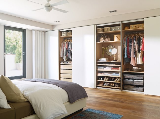 При обустройстве гардеробной необходимо подумать над тем, чтобы в комнате не стало меньше места, кровать с широким изголовьем оставалась в простом доступе, окно не было загромождено. Важно не нарушить геометрию помещения, сохранить эргономику. Поэтому к выбору типа планировки следует подходить очень ответственно. Учитывая габариты спальни, наличие свободного пространства, можно выбрать один из следующих видов: