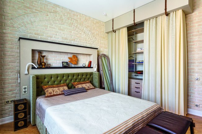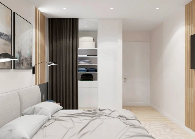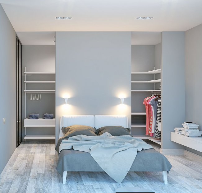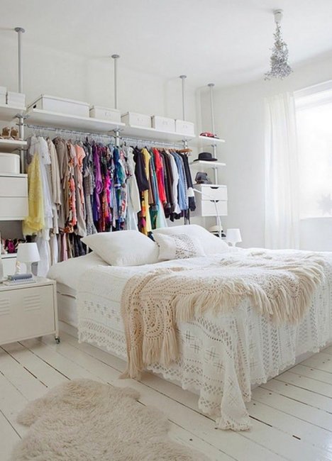 Для многих организация гардеробной в спальне становится невыполнимой задачей. Такие проекты по карману далеко не каждому владельцу типовой квартиры. Найти выход из ситуации и воплотить мечту в жизнь помогут современные дизайнерские решения. Своими рукам можно легко провести бюджетное зонирование и создать удобное место для хранения всех вещей, которое гармонично впишется в интерьер. Его не придется совмещать с мебелью.