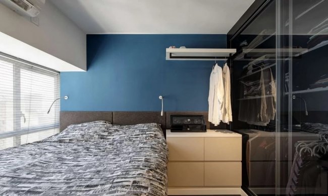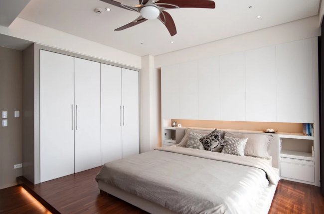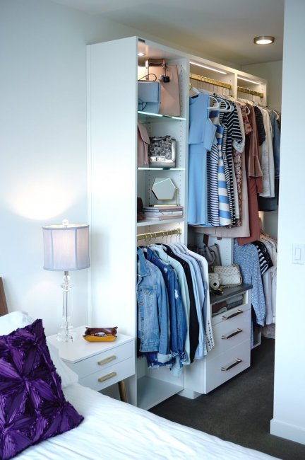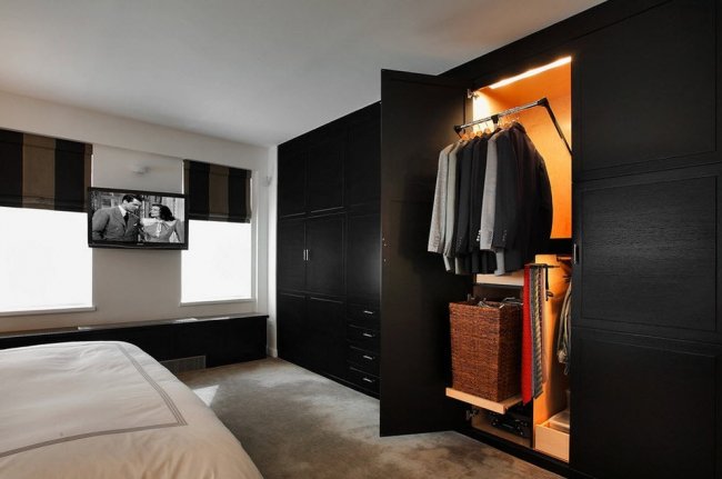 Если в спальне отсутствуют ниши, выход на балкон или лоджию, то придется выделять место внутри помещения. Линейная гардеробная может стать незаменимой для больших по площади комнат. Она располагается вдоль глухой стены, на которой отсутствуют окна и двери. Такой тип планировки не нарушит существующую геометрию, а при правильном оформлении идеально впишется в интерьер.