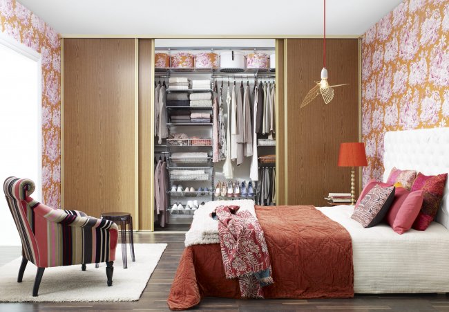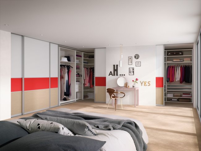 Более яркие цвета можно выбирать, если гардеробная находится в просторной комнате или этого требует дизайн помещения. Двери встроенных шкафов часто украшают яркими узорами, ширмы и перегородки монтируют под потолком и выбирают рисунок с вертикальными линиями. Такой дизайнерский прием визуально поднимет потолки в прямоугольной комнате и в виде квадрата.