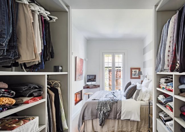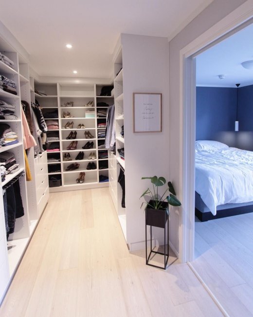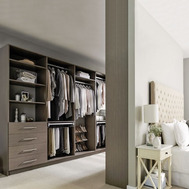 Уборную можно организовать в любом по площади помещении. Она подразумевает под собой открытый способ хранения вещей, в ней отсутствуют ограждения и двери. Она является частью самой спальни, гармонично вписывается в интерьер. Гардеробная подобного плана все же остается невостребованной многими домовладельцами, из-за неспособности или отсутствия возможности постоянно поддерживать аккуратный внешний вид.