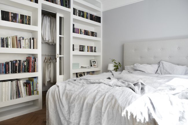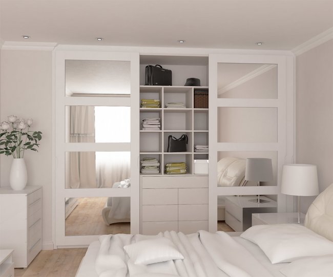 Для маленькой спальной комнаты такая гардеробная будет настоящей находкой. Встроенный шкаф будет сливаться с общим интерьером и станет неотъемлемой частью помещения. Они занимают максимум пространства от пола и до потолка, что позволяет расположить больше полок и ящиков для хранения. Все модели удачно впишутся в любую комнату нестандартной планировки, что позволит избежать зазоров между стенкой шкафа и вертикальной поверхностью.