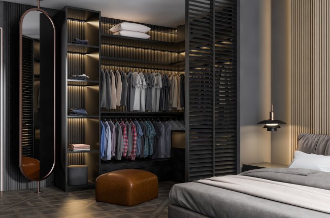 Размер зоны для хранения вещей имеет огромное значение, поэтому важно рассчитать этот параметр еще на этапе проектирования. Чтобы правильно установить габариты для уборной, расположенной в спальне, необходимо определить тип и количество хранимой там одежды, выполнить зонирование, установить ширину и длину. Также во внимание следует брать площадь самой комнаты, либо отдельной ниши.