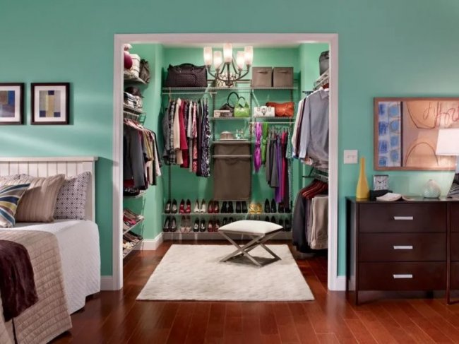 Выбор цвета отделки и предметов наполнения комнаты для хранения вещей зависит от основного стилевого направления спальни. Необходимо учитывать размер комнаты, чтоб не исказить ее визуальное восприятие. Если устройство и отделка гардеробной будет светлой, это зрительно расширит комнату. Чаще используют пастельные оттенки розового, бежевый, голубой, салатный.