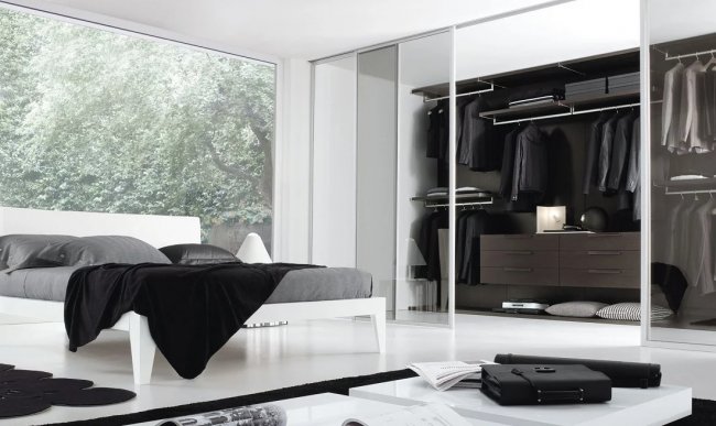 Конструкцию сложно назвать полноценной гардеробной, ведь она представляет собой шкаф-купе. Однако если выбрать достаточно большую модель, она сможет не только удивить своей функциональностью, но и гармонично дополнить интерьер помещения, стать его изюминкой. Подобная мебель имеет глубину около метра, встречаются и более глубокие варианты, которые, по сути, можно использовать как небольшую комнату, даже переодеваться внутри.