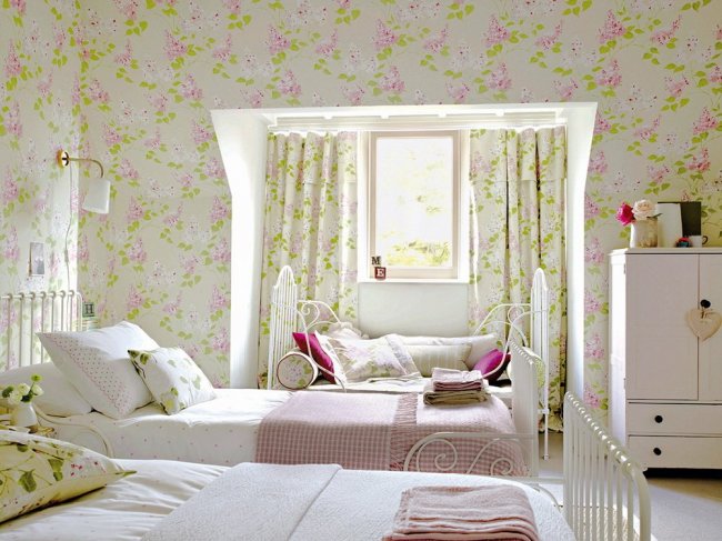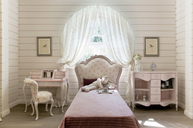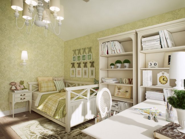 Перед тем как начать оформлять помещение, нужно определиться с главным цветом. Девочкам нравится мечтать и отдыхать в окружении кремовых, розовых, молочных оттенков. Мальчики предпочитают салатовые, голубые тона. В детской стены отделывают обоями или красят, потолок оштукатуривают. Ребенку понравится расписная стена, возле которой можно организовать игровую площадку. Пространство разграничивают мебелью. Место для игр дополняют мягким ковром, плетеными коробами для игрушек, небольшим столиком, стульчиками. У стены устанавливают шведскую стенку. Зону для сна организовывают в дальней части комнаты, отделяют ширмой или деревянным стеллажом. Для творчества и уроков у окна располагают стол, настенные полки. В детскую можно купить готовый гарнитур из массива или МДФ, распределить предметы по зонам. Стиль прованс в комнате мальчика подчеркивают текстилем в клетку и полоску. Девочкам выбирают покрывала и шторы с разбросанными по хлопковой ткани букетиками.