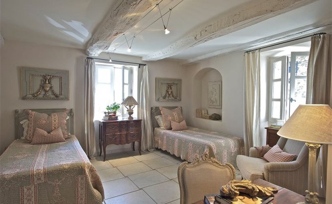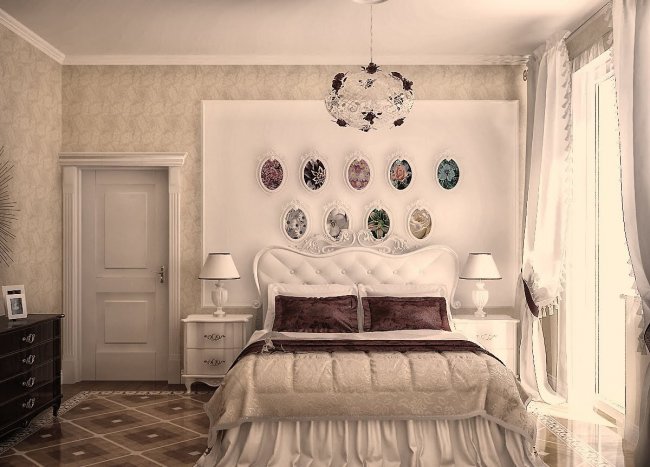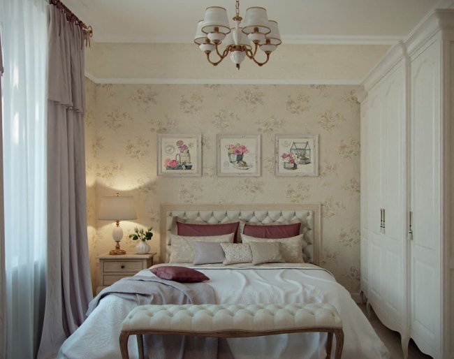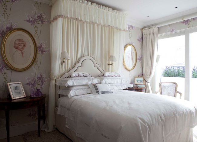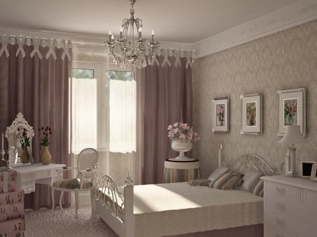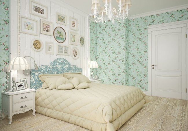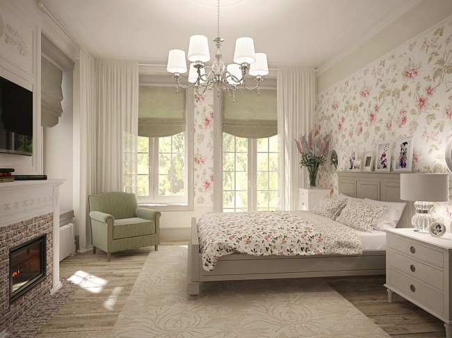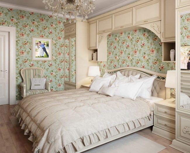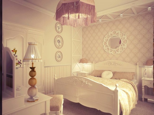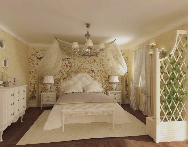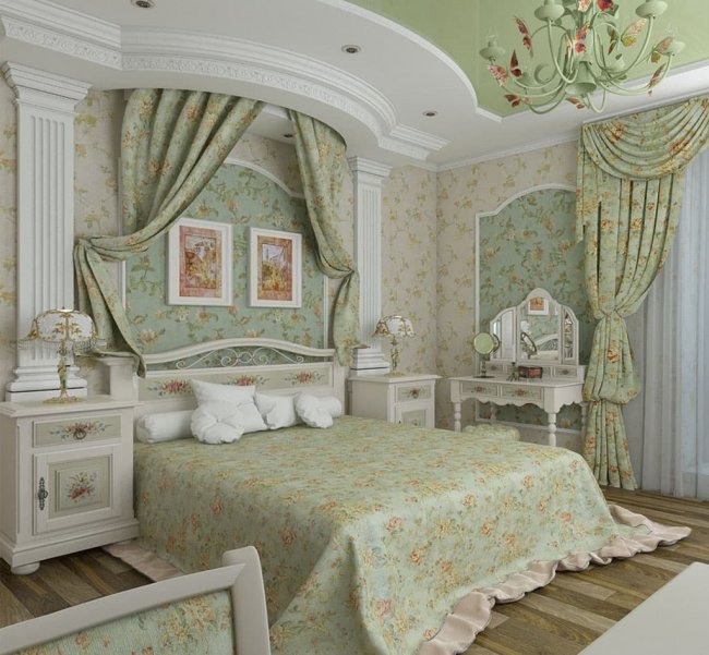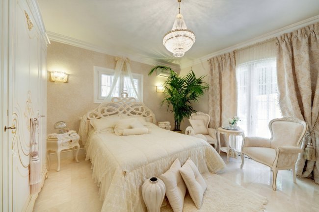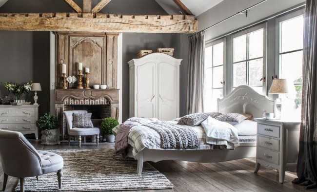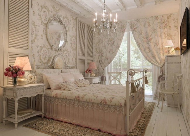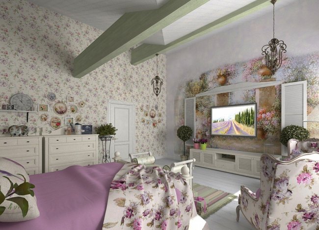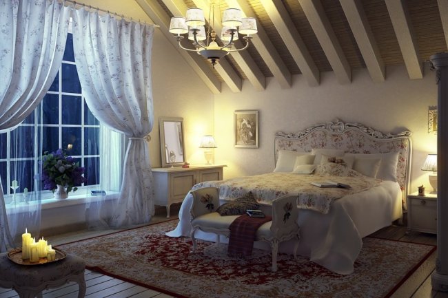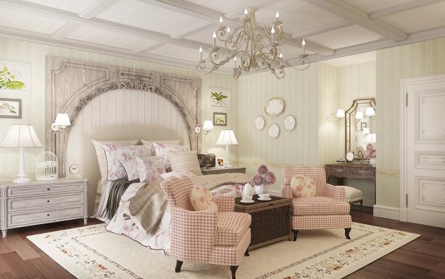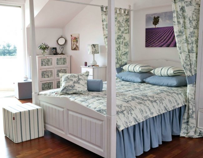 Мелкие предметы вносят в помещение частицу французского шарма. Спальню в стиле прованс не перегружают декором. На прикроватной тумбочке уместна небольшая керамическая ваза с веточками лаванды и шкатулка для ювелирных украшений. Подоконники озеленяют геранью, фиалками, азалией, комнатными розами.