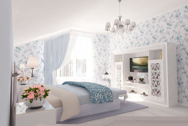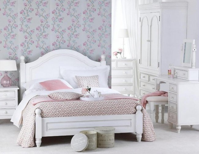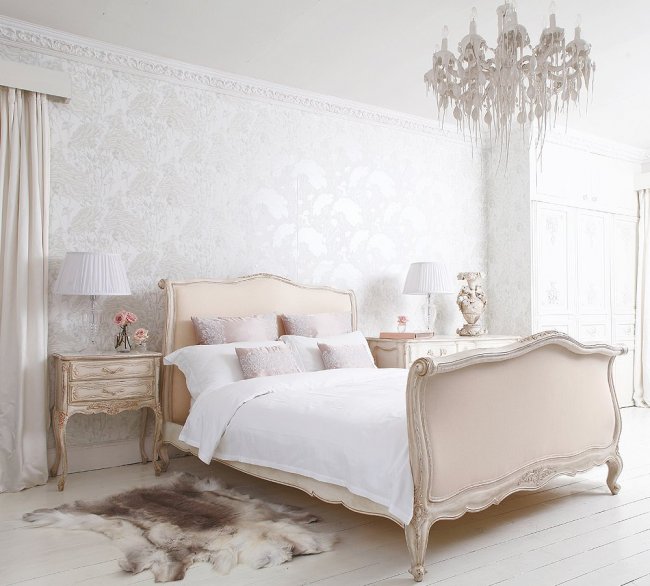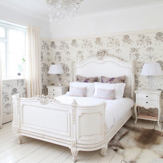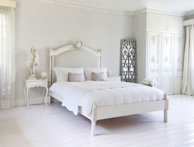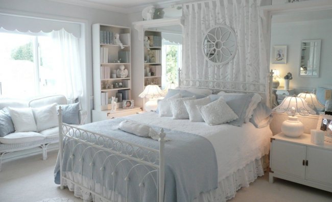 Палитра белого многообразна, чем сложнее подтон, тем интереснее он выглядит. Ярко-белый цвет ассоциируется с прохладой. Мягкий и теплый молочный оттенок дает ощущение спокойствия и безопасности. Белый придает спальне прованс благородства и винтажности, в утренние часы заряжает позитивом, вечером расслабляет. Цвет сочетается с деревом, кружевом, льняным текстилем, всеми пастельными оттенками. Комнату можно оформить полностью в белых тонах: от потолка и пола, до мебели и аксессуаров. Если белая спальня кажется скучной и слишком простой, добавляют прикроватные коврики, покрывала, подушки золотисто-медного, нежно-голубого, бежевого, светло-серебряного цвета. Серые и голубые акценты делают интерьер строгим и сдержанным. Лавандовые, розовые, кремовые оттенки создают романтическую атмосферу.