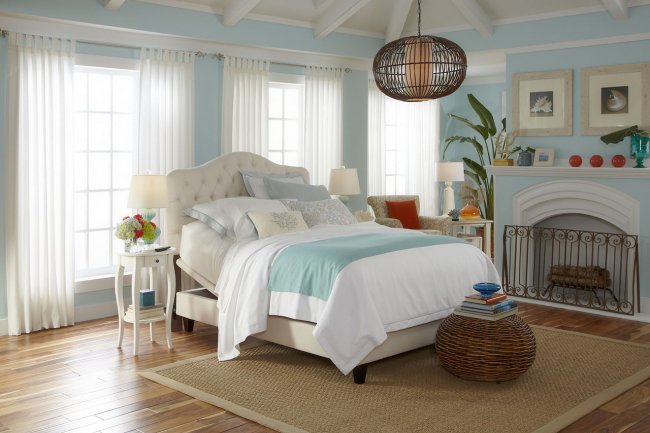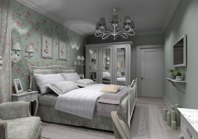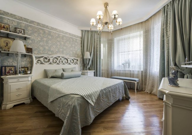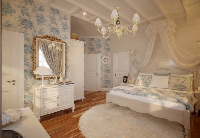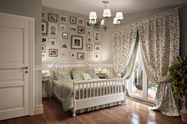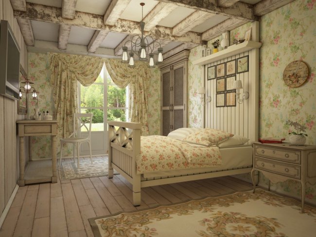 Основные черты прованса – натуральность материалов, обилие света, стилизация под старину. В комнате не должно быть пластика, синтетики, ковролина. В малогабаритной квартире спальня может находиться на темной стороне. Для иллюзии более светлого пространства сочетают небесно-голубые и белые оттенки, не используют массивные гардины. В загородном доме для спальни выбирают большое и светлое помещение. Прованс не минималистичное направление, хорошо, если в комнату поместится кровать с коваными вставками, шкаф, комод, плетеное кресло-качалка. Не нужно покупать дорогие гарнитуры с резьбой, обилием декора. Мебельные фасады достаточно украсить декупажем, трафаретной росписью.