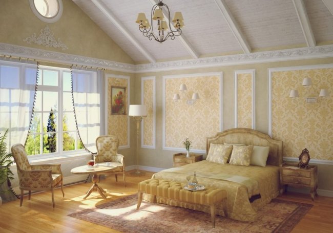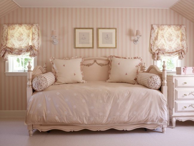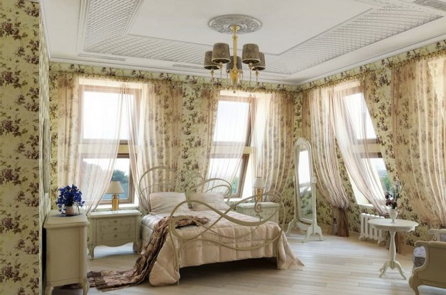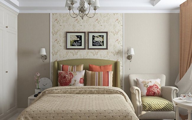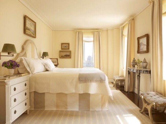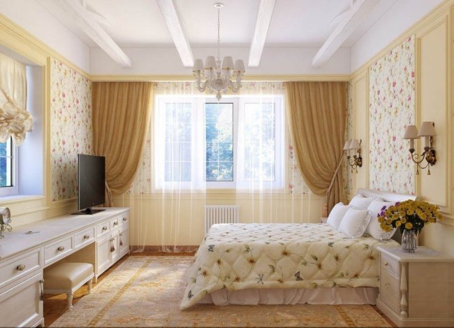 Бежевые тона успокаивают, не отвлекают внимания, положительно действуют на психику, сочетаются с контрастным декором. Расцветка не скрадывает пространство, подходит для маленьких комнат. Бежевые оттенки различаются насыщенностью. Спальню в стиле французского кантри оформляют в кремовых, пшеничных, песочных, палевых тонах. Чтобы цвета не растворялись друг в друге, кровать накрывают розово-бежевым покрывалом. В провансе беж используют в тандеме с голубым, лавандовым, салатовым, белым. На фоне нейтральных бежевых стен красиво смотрится белая и кремовая мебель, бирюзовые, желтые и фиолетовые аксессуары. Шторы выбирают в одном цветовом спектре, но более темного или светлого оттенка. Монохромные поверхности дополняют текстилем с вкраплением неяркого красного, синего цвета. Для стен с орнаментом выбирают однотонные портьеры.
