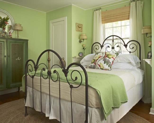 Мятный, оливковый, серо-зеленый, фисташковый цвета стабилизируют душевный настрой, наполняют комнату весенней свежестью. Полностью оформлять спальню в салатовой гамме не нужно. Бледно-зеленые стены гармонируют со светло-коричневым полом, шкафом и кроватью молочного оттенка. Составляет единый ансамбль с белыми поверхностями нежно-оливковый спальный гарнитур и более насыщенные шторы. Мебель покупают или окрашивают в приглушенные тона. Для придания яркости выбирают обои, шторы, покрывала, абажур, прикроватный коврик с орнаментом оттенка летней зелени. Пастельно-травяные стены сочетаются с кремовыми, лавандовыми, кофейными шторами. Бело-оливковый интерьер делает светлее помещение, расположенное на северной стороне.