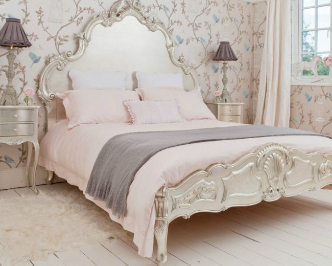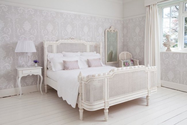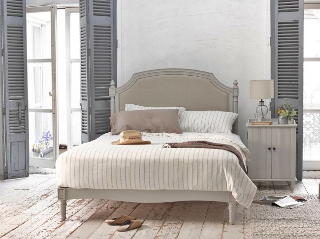 Кровать должна соответствовать канонам французского кантри – натуральные материалы, отсутствие вычурного декора. Изделия из дерева выглядят немного громоздкими за счет высокого изголовья. Изящные высокие ножки, простая резьба, деревянная мозаика, скромное изножье уравновешивают массивную конструкцию. Гармонирует с прованским стилем кованое изголовье с плавными линиями, витиеватыми узорами. Спинки старой кровати, для создания в спальне провинциального колорита, украшают коваными вставками, резными элементами. Коричневую древесину после обработки мелкой шкуркой перекрашивают в цвета прованса. В маленькой комнате массивное ложе заменяют раскладным диваном с высокой закругленной спинкой. Обивку выбирают из жаккарда, гобеленовых тканей с неконтрастным цветочным узором, полоской.