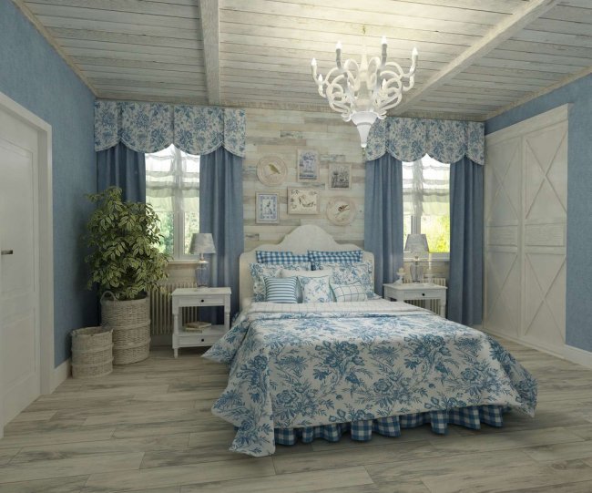 Выбранные расцветки должны успокаивать, создавать впечатление безмятежности, солнечного морского побережья. В оформлении задействуют цвет пожухлой травы, пепельной розы, лаванды, мяты. Потолок окрашивают в белые тона, пол – в песочные, горчичные, дымчато-серые. Чем светлее отделочный материал, тем гармоничнее он вписывается в стиль. В сочетании с белоснежной потолочной поверхностью красиво смотрятся выбеленные доски. Эффект «беленый дуб» создают пигментным составом или маслом с воском. Стены оформляют белым цветом, спокойными полутонами голубого, розового, сиреневого. Интересный колорит прованской спальне придают небольшие включения терракотового, лимонно-желтого, зеленого, винного цвета, теплые нотки охры. Удачно сочетаются оттенки «слоновая кость», серо-голубой, светло-зеленый, приглушенный фиолетовый. Более ярко выглядит комбинация молочного, желто-коричневого, зеленого, сиреневых тонов.