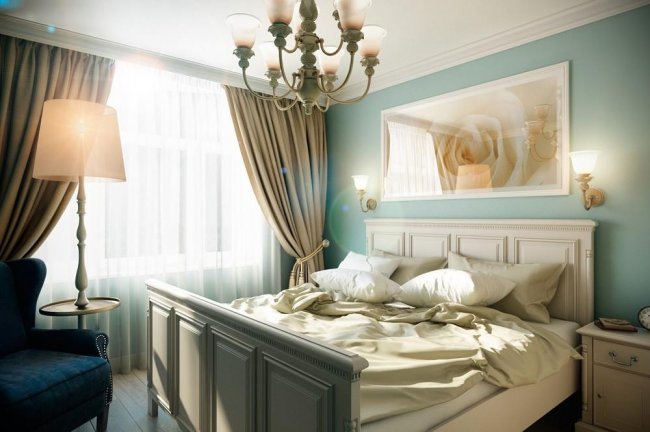 Слишком много синевы в спальне угнетает, навевает тоску. Мрачные нотки компенсируют белоснежными гардинами с подхватами и завязками.