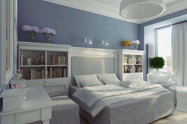 Дизайн в синих тонах универсальный, нравится мужчинам и женщинам. Небесные и серо-голубые тона визуально расширяют комнату, компонуются с белым, синим, бежевым. Пыльно-синие обои и штукатурка наполняют теплом, но сужают стены. В помещении должно быть большое окно или многоуровневое искусственное освещение. Темные оттенки утяжеляют интерьер, применяются для акцентов. Чтобы комната выглядела гармонично, синий комбинируют с другими цветами.