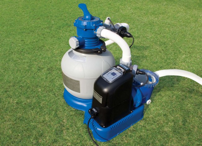 Фильтрующая установка с хлоргенератором, вырабатывающим хлор из обычной соли, позволит не тратиться на покупку дезинфицирующих препаратов. Однако сам прибор гораздо дороже обычного фильтра, а срок его службы составляет 3-6 лет: устройство может не окупиться. Фото: INTEX