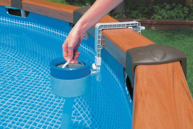 Скиммерное устройство крепят к борту бассейна; сетчатый уловитель устройства нужно периодически очищать от крупного мусора. Фото: INTEX