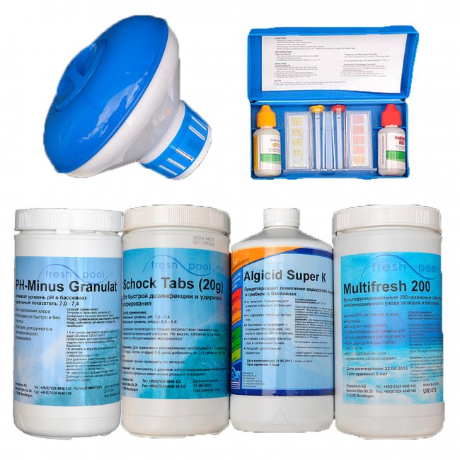 5. Основных препаратов всегда два – для дезинфекции и для борьбы с водорослями. При этом они усиливают действие друг друга. Применяя только одно средство, например «Хлоритекс» (без внесения «Альгитина»), вы довольно скоро увидите, что вода начала зеленеть.