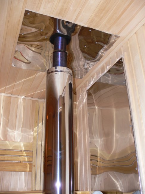Как правило, заводские каменки оснащают дымоходом из стальных двухстенных (двухконтурных) утеплённых труб. Наличие термоизоляции из каменногй ваты или перлитного песка снижает риск ожогов и пожара, уменьшает количество дымового конденсата и способствует стабильной тяге. Для прохода стены или крыши лучше использовать готовый термоизолирующий модуль.