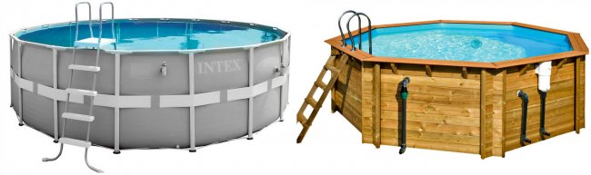Наземные бассейны с ламинированным пластиковым или деревянным бортом (справа) стоят в 2–4 раза дороже классических «каркасников». Фото: Procopi, INTEX