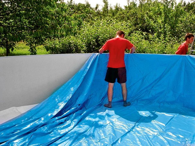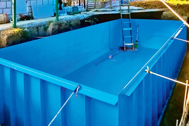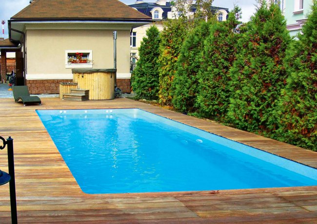 Чаще всего заглубляют композитные чаши (их производят компании Compass Pools, Fiberpools, Franmer и др.) — морозостойкие и способные противостоять значительным нагрузкам. В основе таких изделий стеклохолст, пропитанный полимерной смолой. Но это лишь основной слой, всего же конструкция может включать до десяти слоёв, одни из которых отвечают за водонепроницаемость, другие — за термоизоляцию, третьи помогают повысить прочность и эластичность стенок. У каждой компании — своя рецептура, причём фирмы стремятся использовать новейшие разработки химии полимеров. Не менее популярны изделия с бортом из оцинкованного стального листа, снабжённые ПВХ-вкладышем (продукция Azuro, GRE, Mountfi eld, Unipool). Они значительно дешевле композитных, но бывают только круглыми и овальными и служат вдвое меньше (10–15 лет): ПВХ-плёнка выгорает и разрушается под воздействием ультрафиолета и химикатов, а металл со временем теряет покрытие и начинает ржаветь.