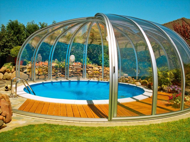Купольный или тоннельный павильон позволяет купаться в ветреную и прохладную погоду, а кроме того, замедляет испарение влаги и снижает интенсивность УФ-излучения. Фото: «АстраПулс»