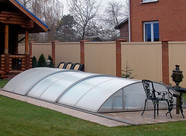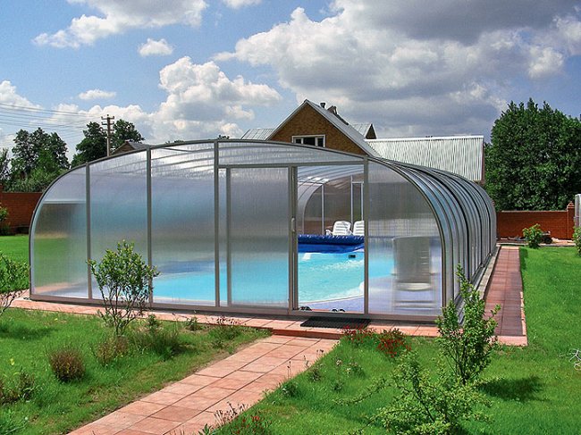 18-21.Климат в России далеко не африканский, и даже не калифорнийский, поэтому чашу установленного на улице композитного бассейна следует прикрывать, используя натяжное(18) или "батутное"(19) пленочное покрытие. Аеще лучше возвести над ним складной(20,21) или стационарный "домик".