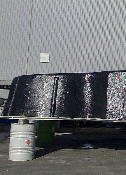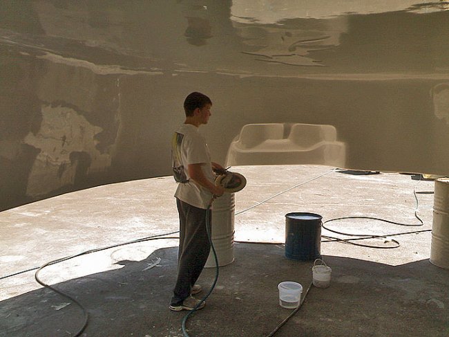 Наконец, защитный слой- специальная краска (топкоут), защищающая чашу от атмосферных и прочих воздействий при хранении, транспортировке ит.д. После отверждения смолы с матрицы осторожно снимают готовую чашу и лобзиком или болгаркой обрезают у нее кромку верхней отбортовки. Внутреннюю поверхность изделия шлифуют и полируют, применяя специальные составы.