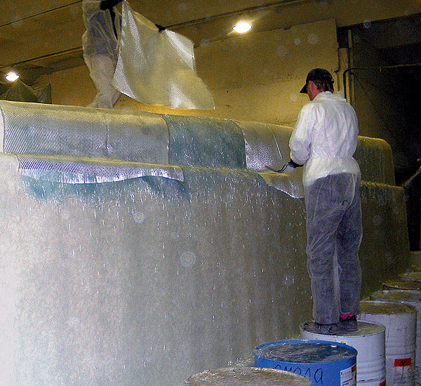 Следующий пласт формируют из нескольких слоев тканого стекловолокна (так называемая стеклорогожа), просмоленного и наклеиваемого вручную. Это делает бригада из четырех рабочих: ткань надо пропитывать смолой и одновременно разглаживать специальными валиками, а из-за сложной формы чаши процесс не поддается автоматизации. Использование ручного труда несколько увеличивает стоимость изделия, но цель оправдывает средства. Ведь именно данный слой- прочный, но достаточно гибкий- способен выдержать как расширение льда (если вода в бассейне замерзнет), так и сезонное пучение грунта.