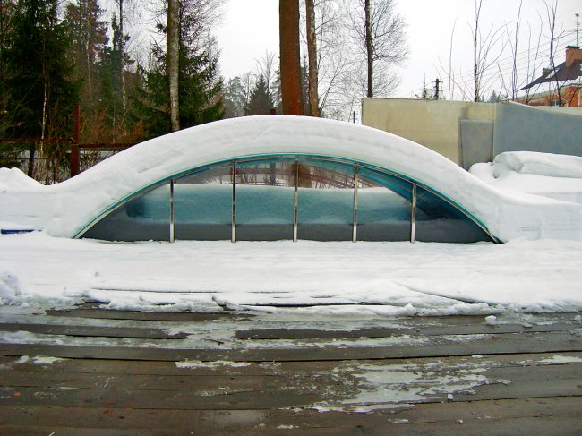 Сборное ограждение безопасности вокруг заглублённого бассейна нельзя демонтировать на зиму. Напротив, следует удостовериться в его надёжности и запереть калитку, ведущую к воде.