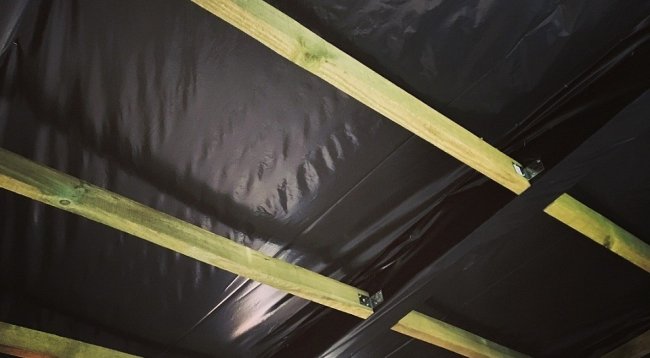 Сверху укладываем гидроизоляцию. Полосы кладутся внахлест, стыки проклеиваются. Далее укладываем доски. Они станут чердачным полом.