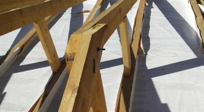 Поверх балок со стороны кровли укладываем гидроизоляцию. Крепим пленку к дереву степлером. Полосы кладем внахлест, перекрывая одной другую на 10 или 15 см. Стыки аккуратно проклеиваем скотчем.